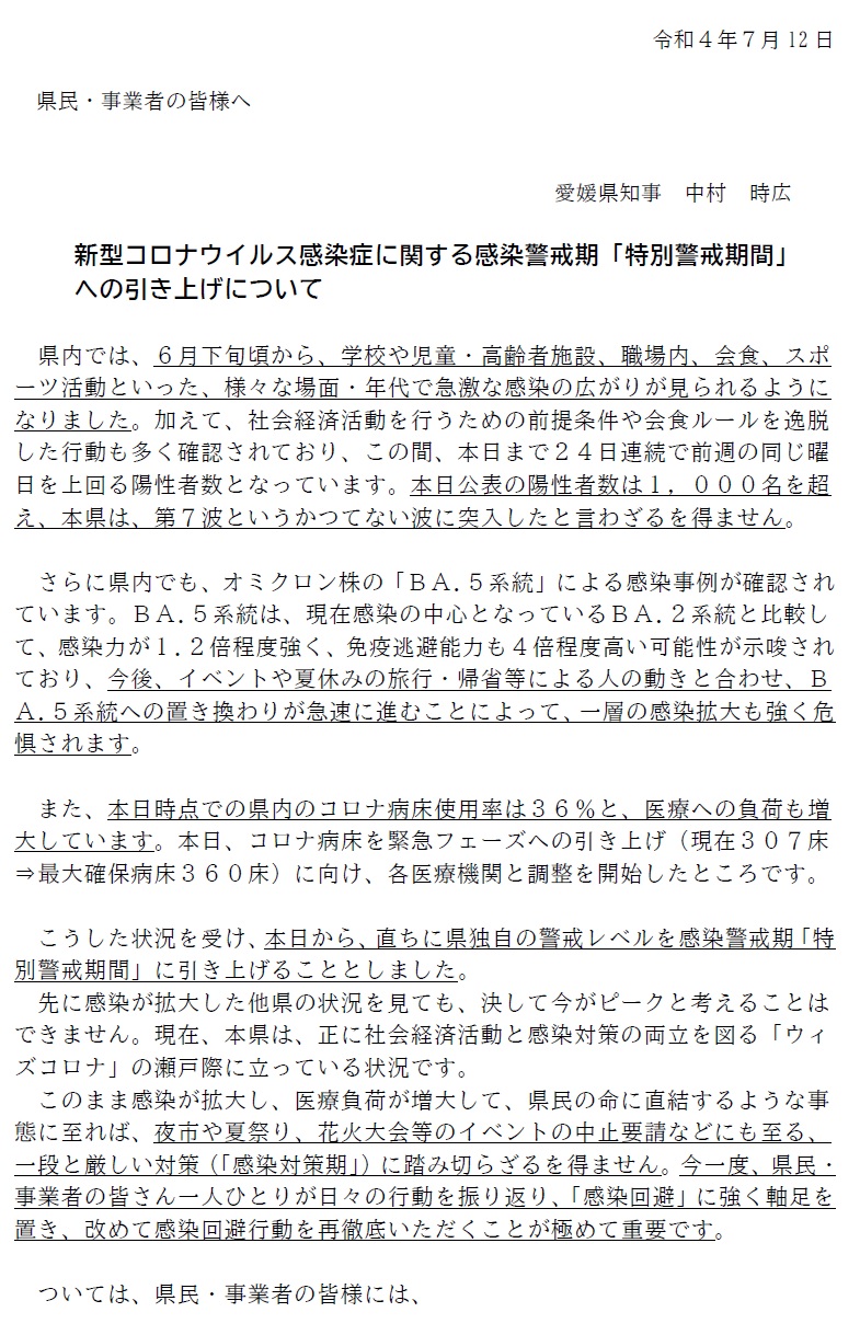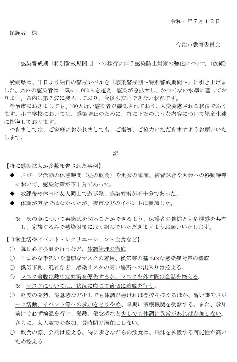 2022年7月13日 10時44分感染警戒期「特別警戒期間」への引き上げについて、県知事メッセージと今治市教育委員会から保護者の皆様への依頼を掲載いたします。本日、お子様を通じてプリントも持ち帰ります。ご理解とご協力の程よろしくお願いいたします。